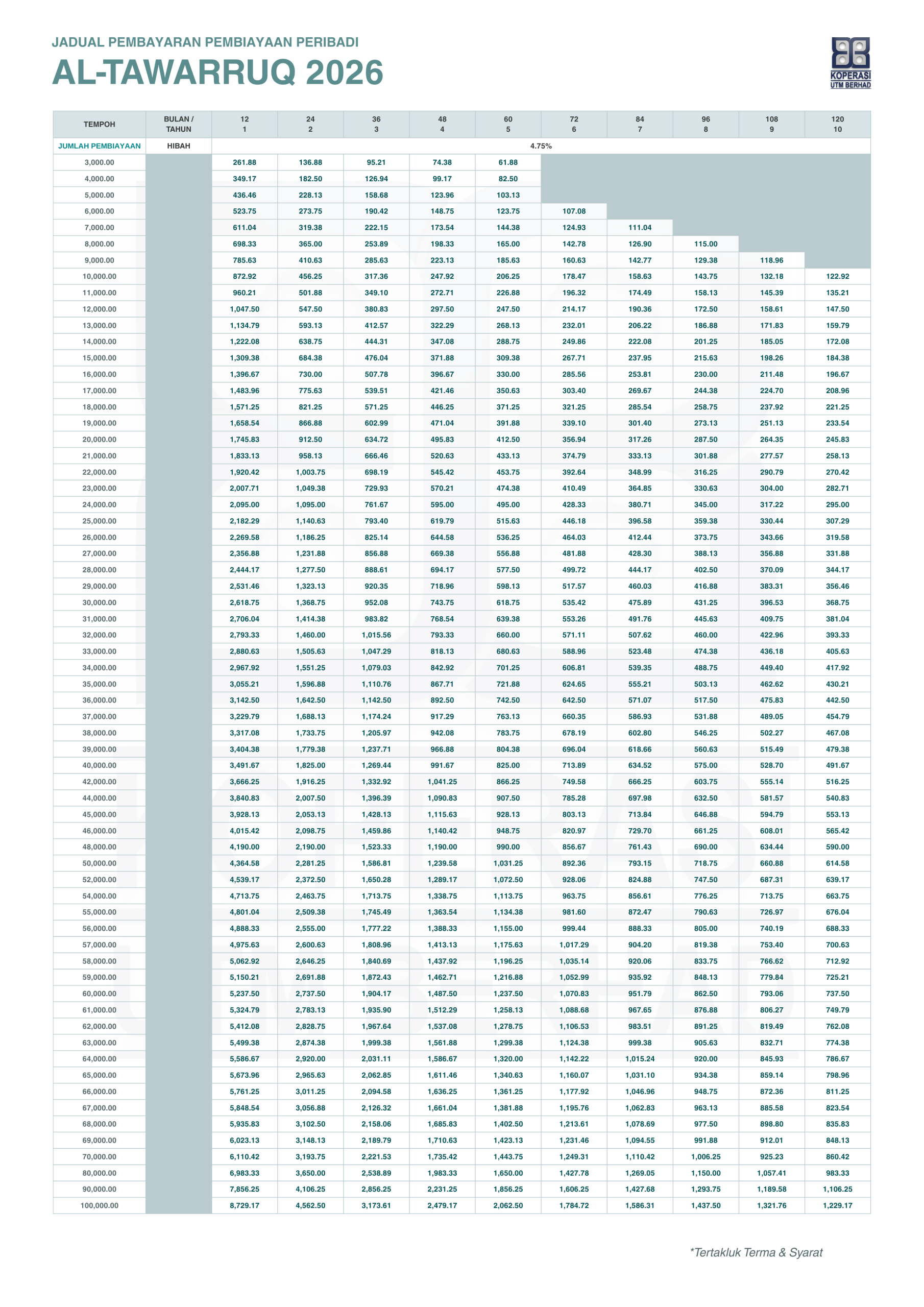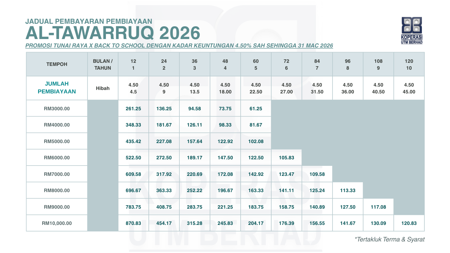 • Kadar Keuntungan yang dikenakan adalah serendah 4.75% setahun (tertakluk kepada perubahan yang akan ditetapkan oleh Koperasi UTM Berhad)